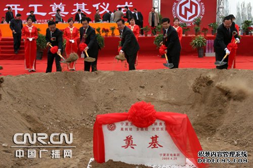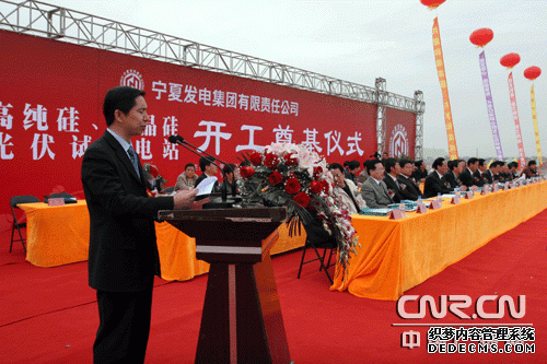 4月26日上午,寧夏發(fā)電集團(tuán)高純硅、多晶硅、太陽能光伏電站等三大項(xiàng)目開工奠基儀式在銀川高新技術(shù)開發(fā)區(qū)重舉行。寧夏自治區(qū)陳建國、王正偉、于革勝等自治區(qū)主要領(lǐng)導(dǎo)參加了奠基儀式。